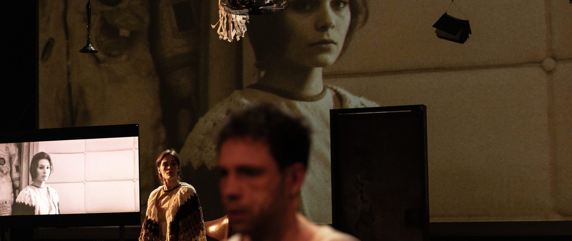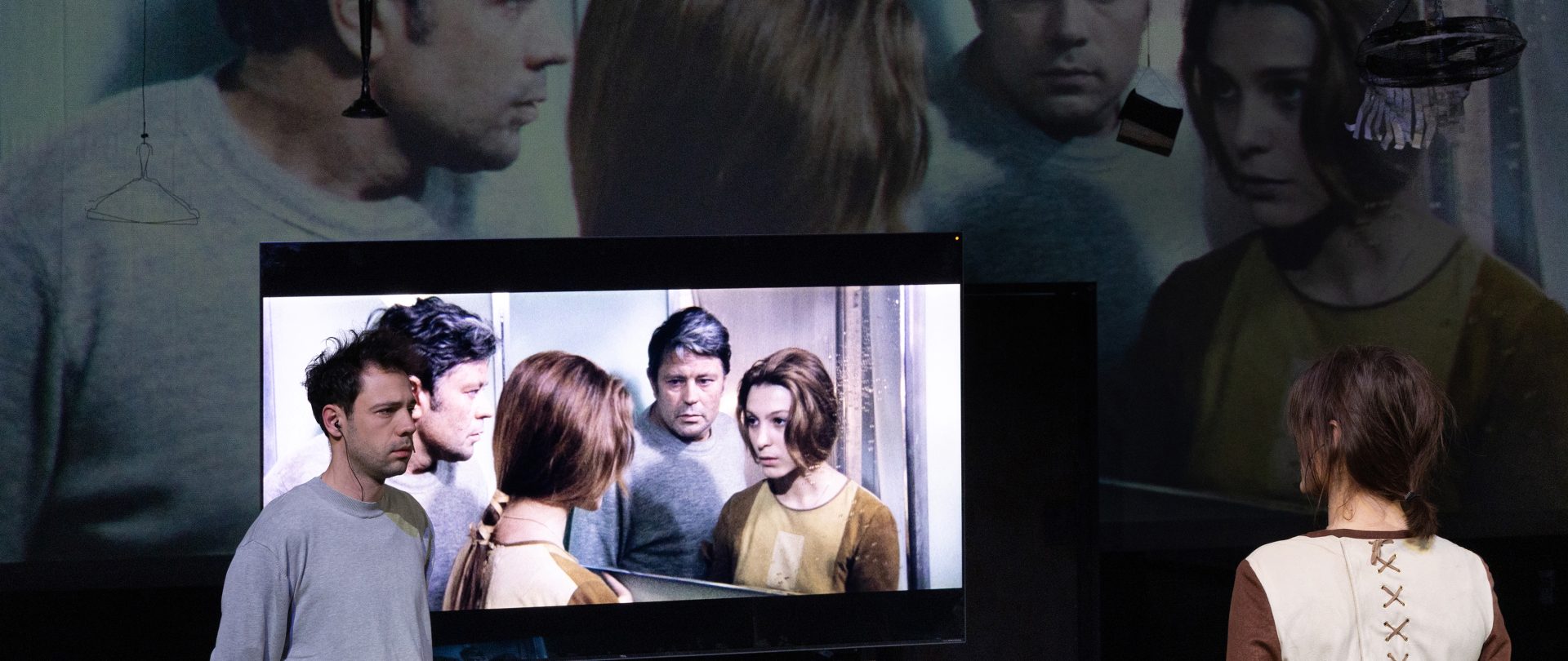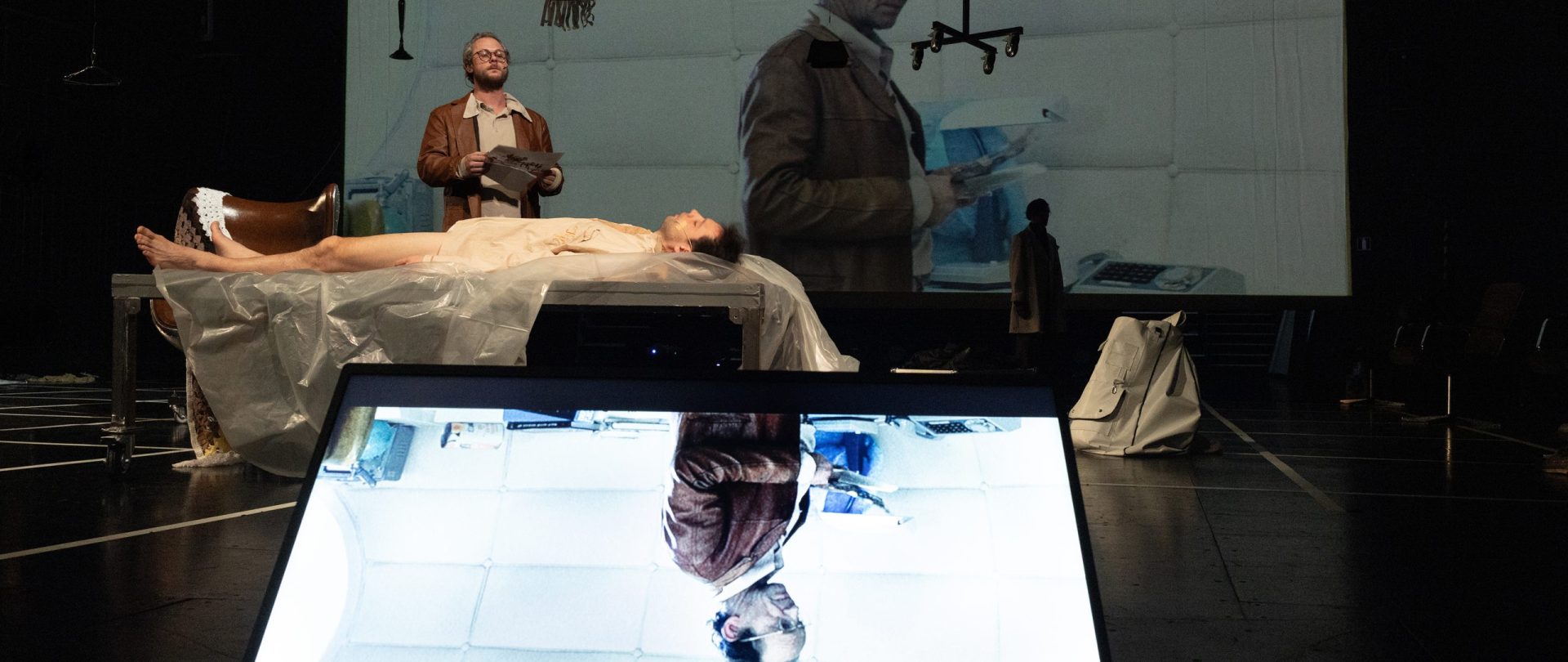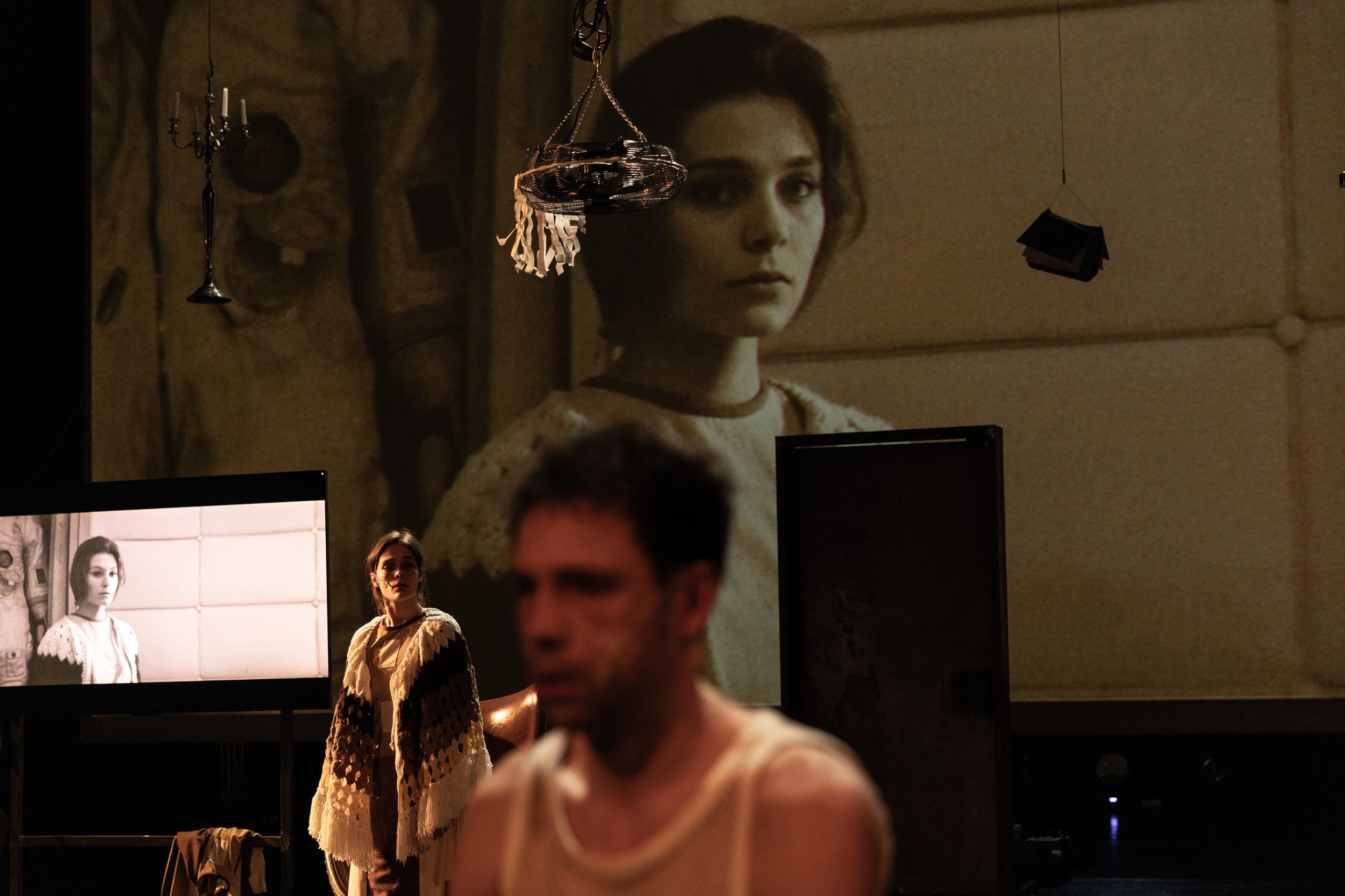 Ovdje je film partitura. Predstava u realnom vremenu uspostavlja tri prisutnosti: originalni film Andreja Tarkovskog, njegovu preciznu scensku rekonstrukciju i računalno generiranu fuziju koja nastaje između ta dva sloja. Film nije “u pozadini” niti služi kao citat – stalno je prisutan referent. Glumci, u istom vremenskom kodu, reproduciraju ritam, pokret i intonaciju filmskih likova, dok deepfake u pojedinim trenucima prelijeva identitet živog izvođača na filmsko tijelo. Tehnologija ovdje nije dodatak nego dramaturgija: dvojnik nastaje pred publikom, a samo gledanje postaje radnja – neprestano provjeravanje onoga što je uživo, onoga što je zapis i onoga što je sintetizirano.