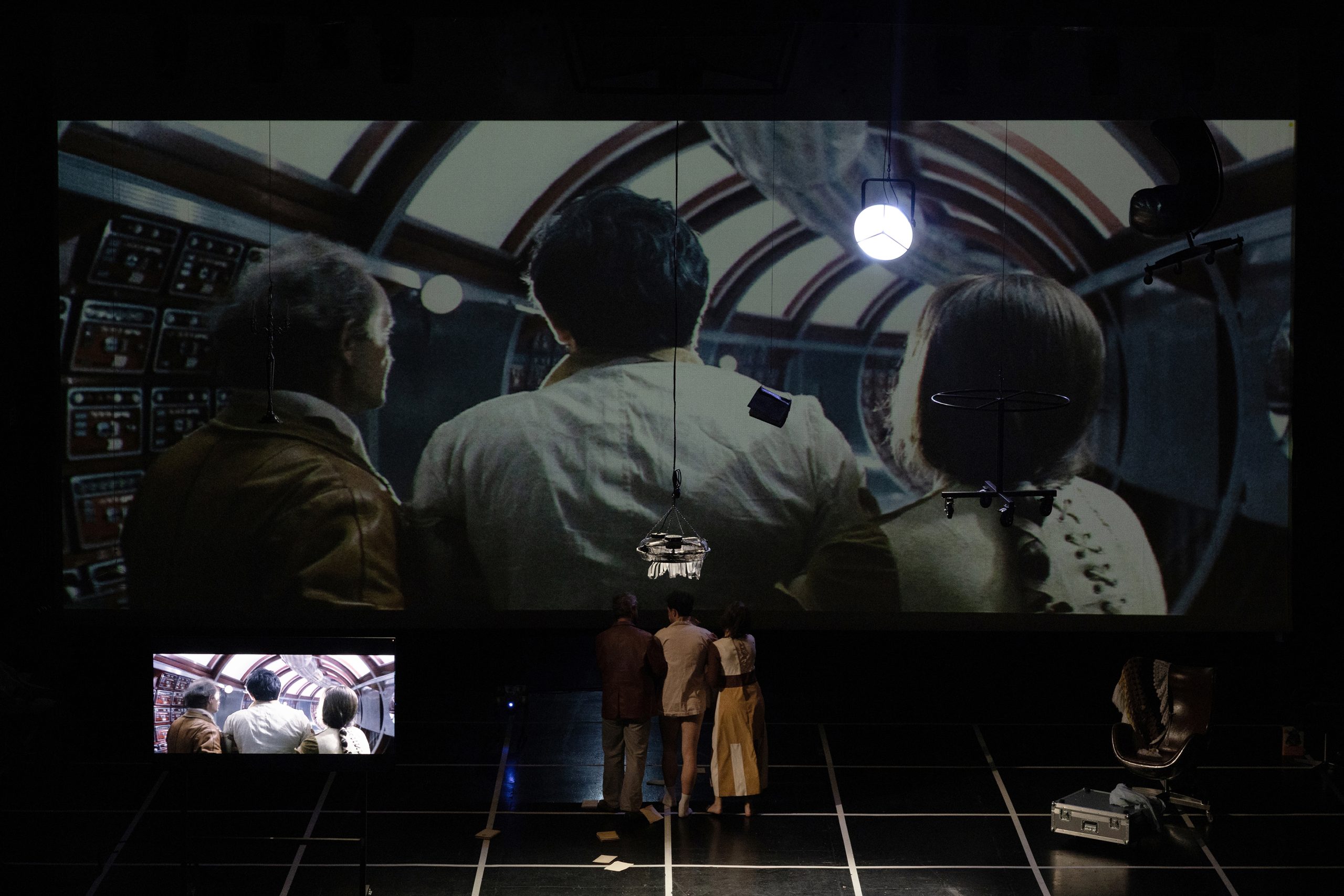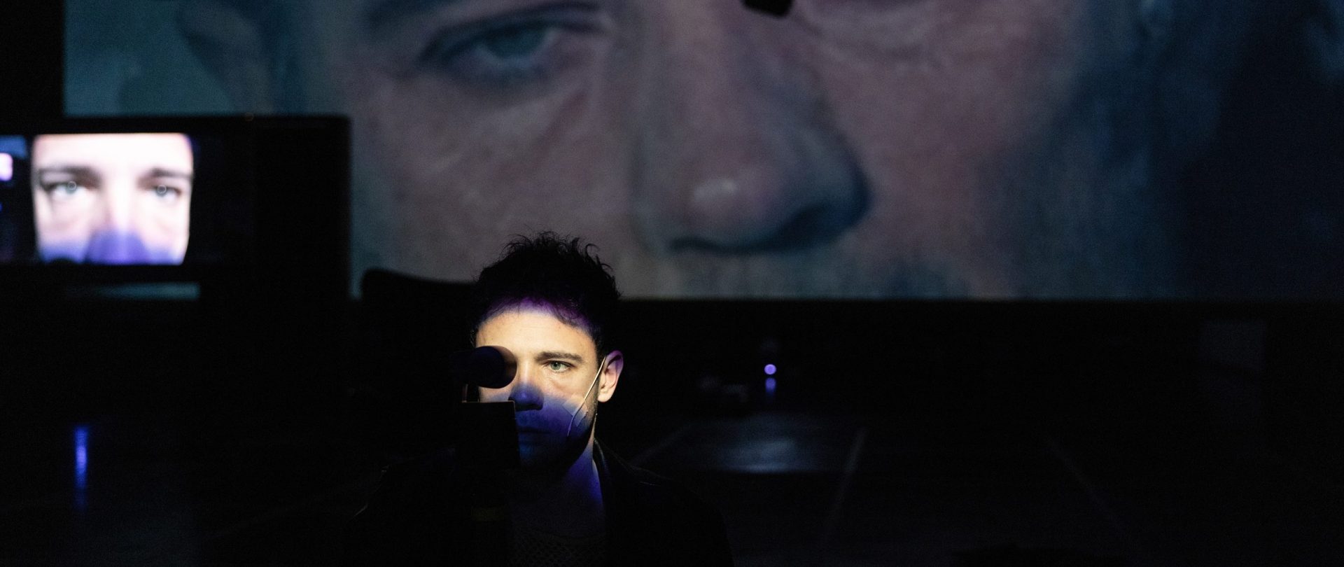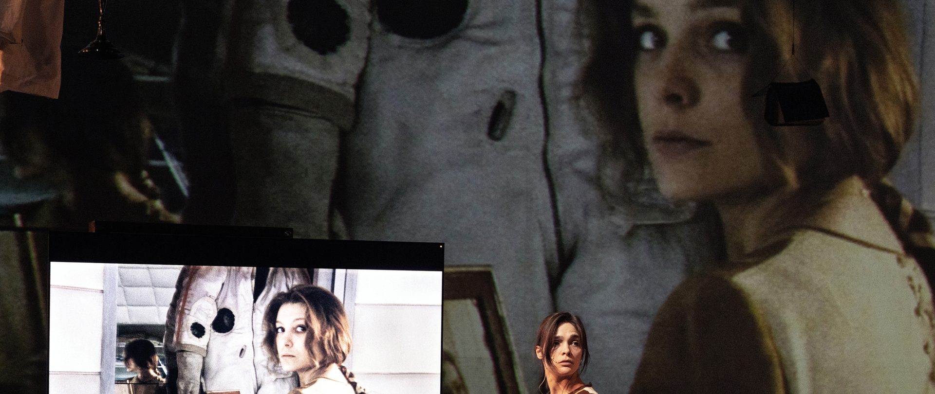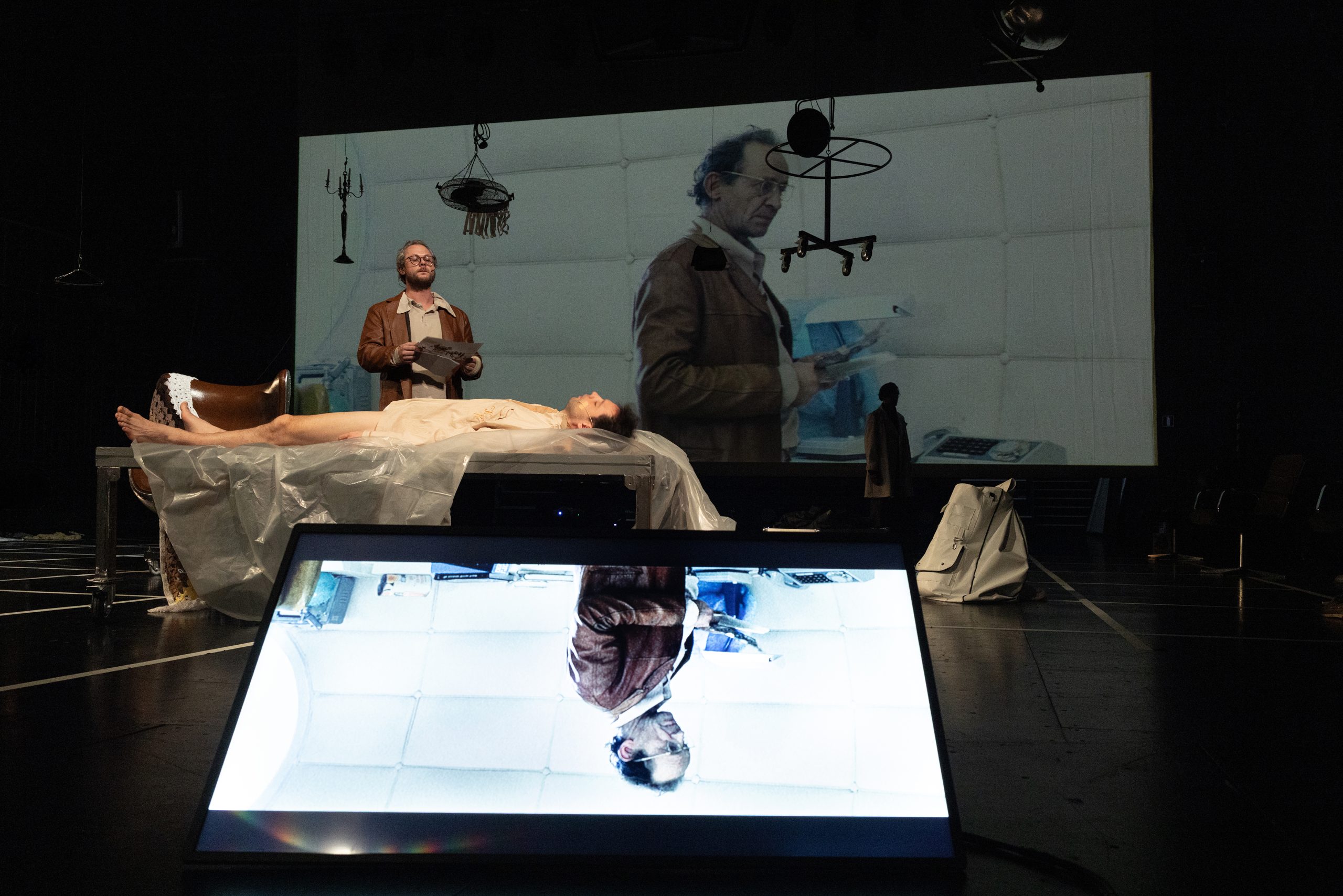 Ovdje je film partitura. Predstava u realnom vremenu uspostavlja tri prisutnosti: originalni film Andreja Tarkovskog, njegovu preciznu scensku rekonstrukciju i računalno generiranu fuziju koja nastaje između ta dva sloja. Film nije “u pozadini” niti služi kao citat – stalno je prisutan referent. Glumci, u istom vremenskom kodu, reproduciraju ritam, pokret i intonaciju filmskih likova, dok deepfake u pojedinim trenucima prelijeva identitet živog izvođača na filmsko tijelo. Tehnologija ovdje nije dodatak nego dramaturgija: dvojnik nastaje pred publikom, a samo gledanje postaje radnja – neprestano provjeravanje onoga što je uživo, onoga što je zapis i onoga što je sintetizirano.