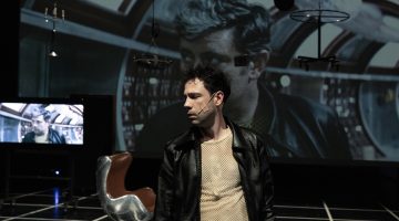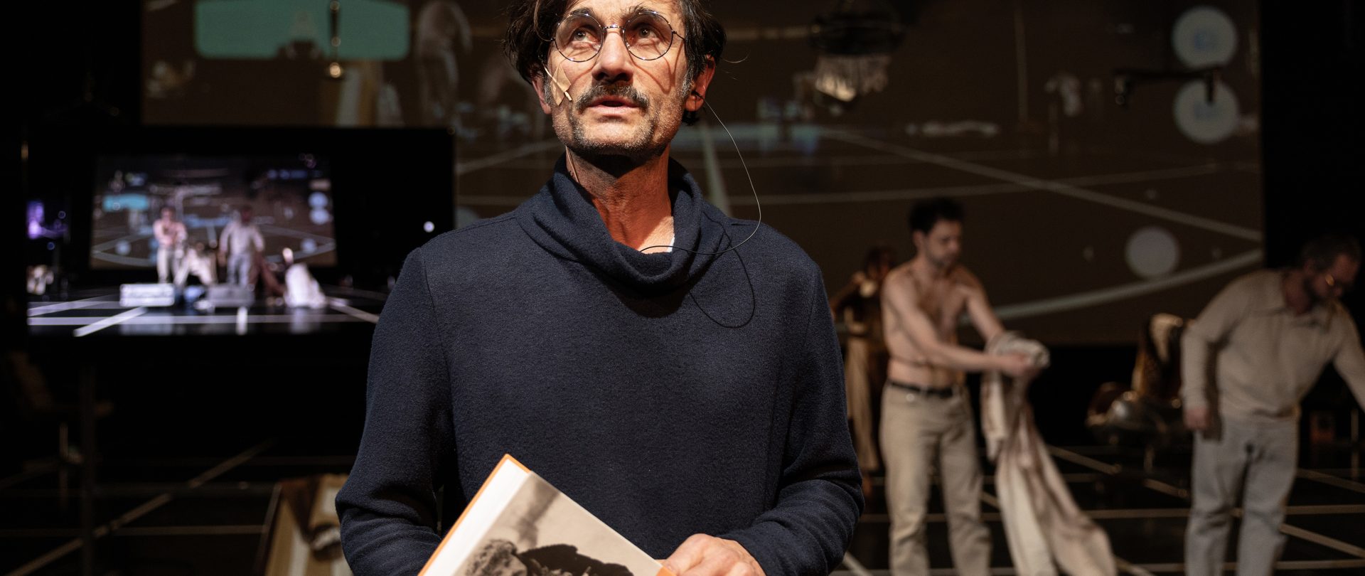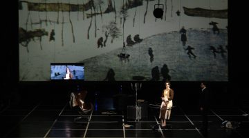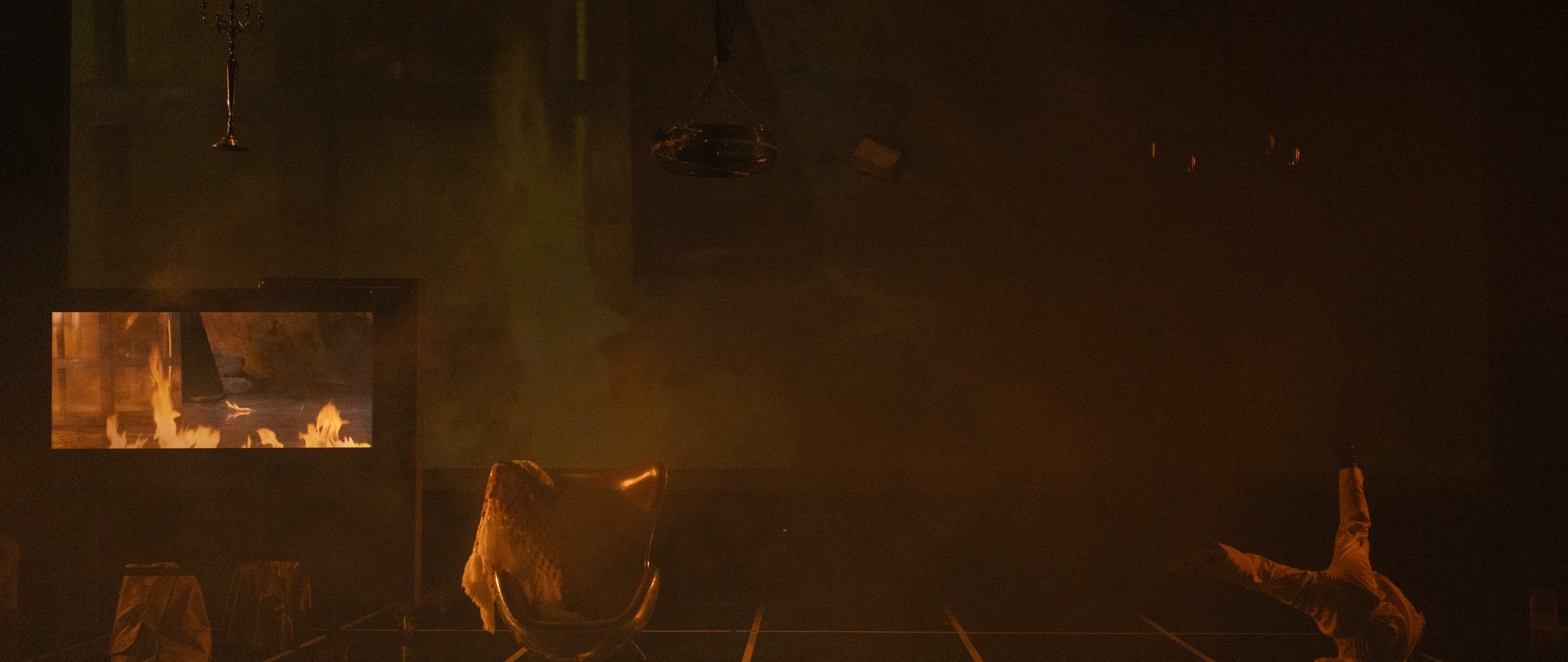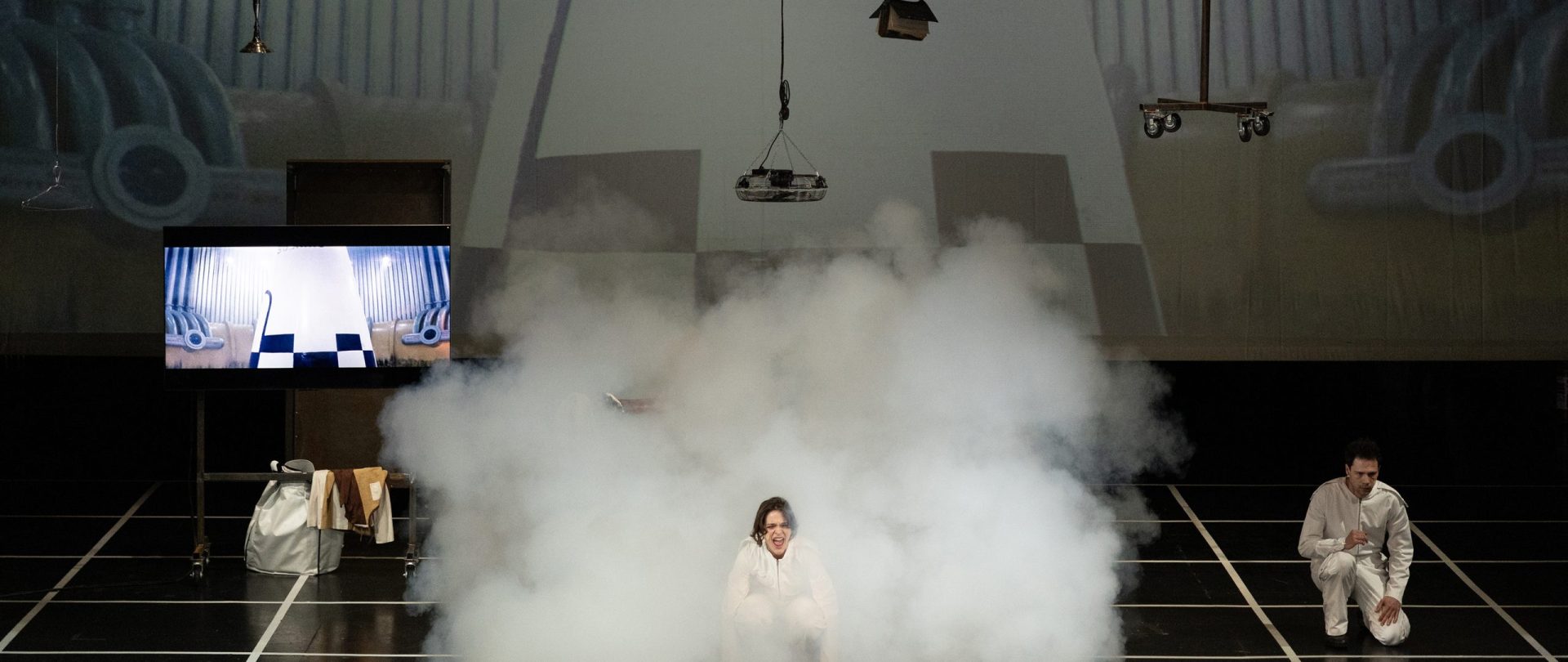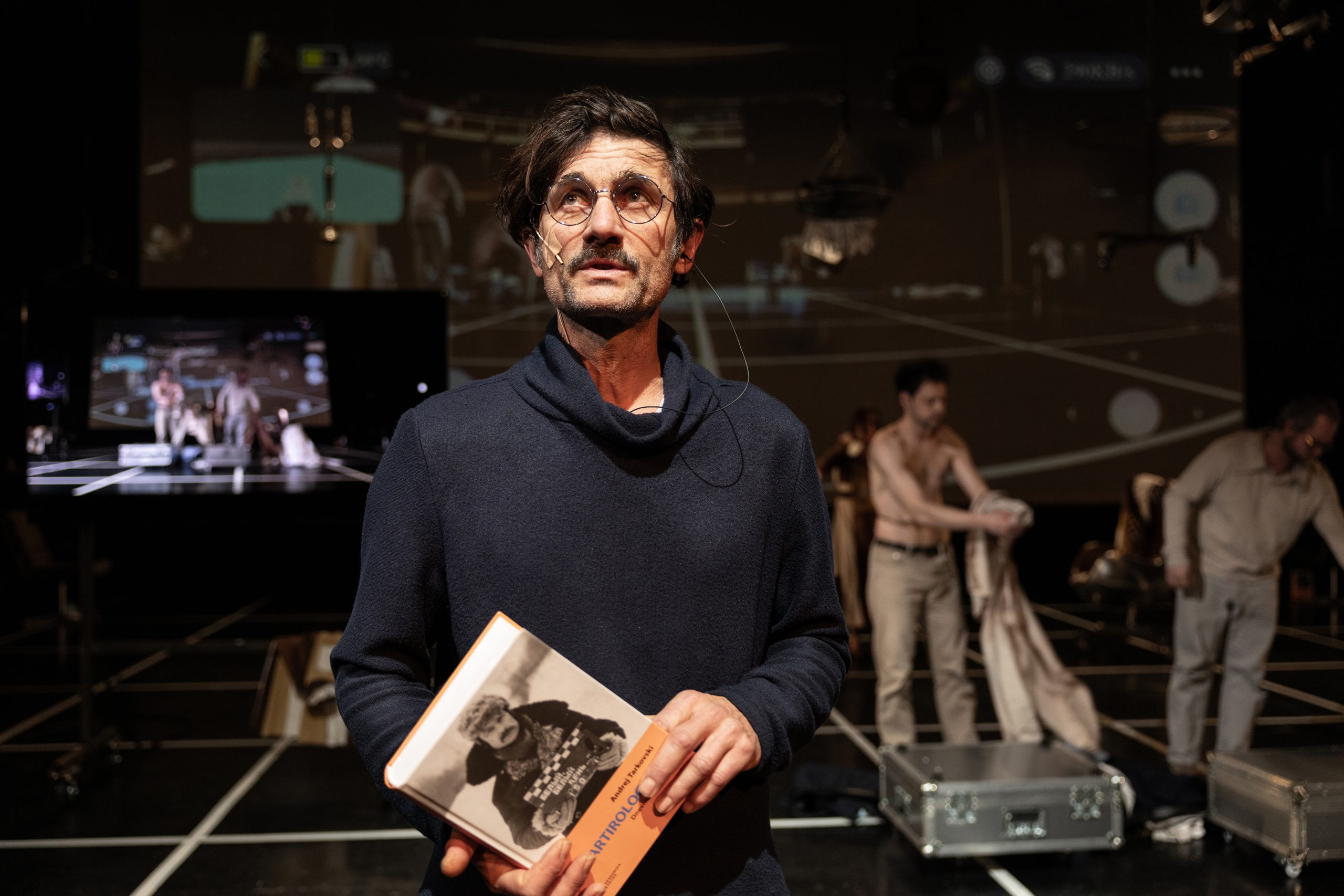 Ovdje je film partitura. Predstava u realnom vremenu uspostavlja tri prisutnosti: originalni film Andreja Tarkovskog, njegovu preciznu scensku rekonstrukciju i računalno generiranu fuziju koja nastaje između ta dva sloja. Film nije “u pozadini” niti služi kao citat – stalno je prisutan referent. Glumci, u istom vremenskom kodu, reproduciraju ritam, pokret i intonaciju filmskih likova, dok deepfake u pojedinim trenucima prelijeva identitet živog izvođača na filmsko tijelo. Tehnologija ovdje nije dodatak nego dramaturgija: dvojnik nastaje pred publikom, a samo gledanje postaje radnja – neprestano provjeravanje onoga što je uživo, onoga što je zapis i onoga što je sintetizirano.