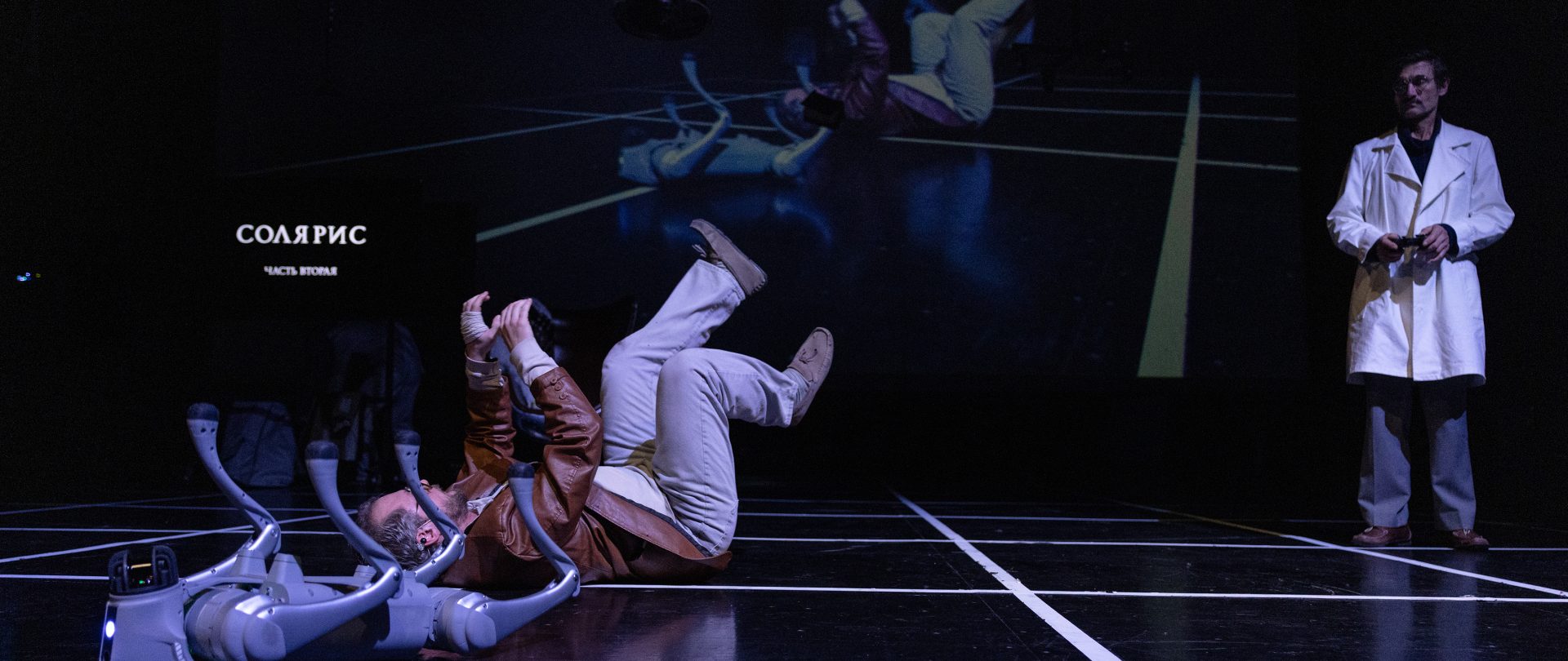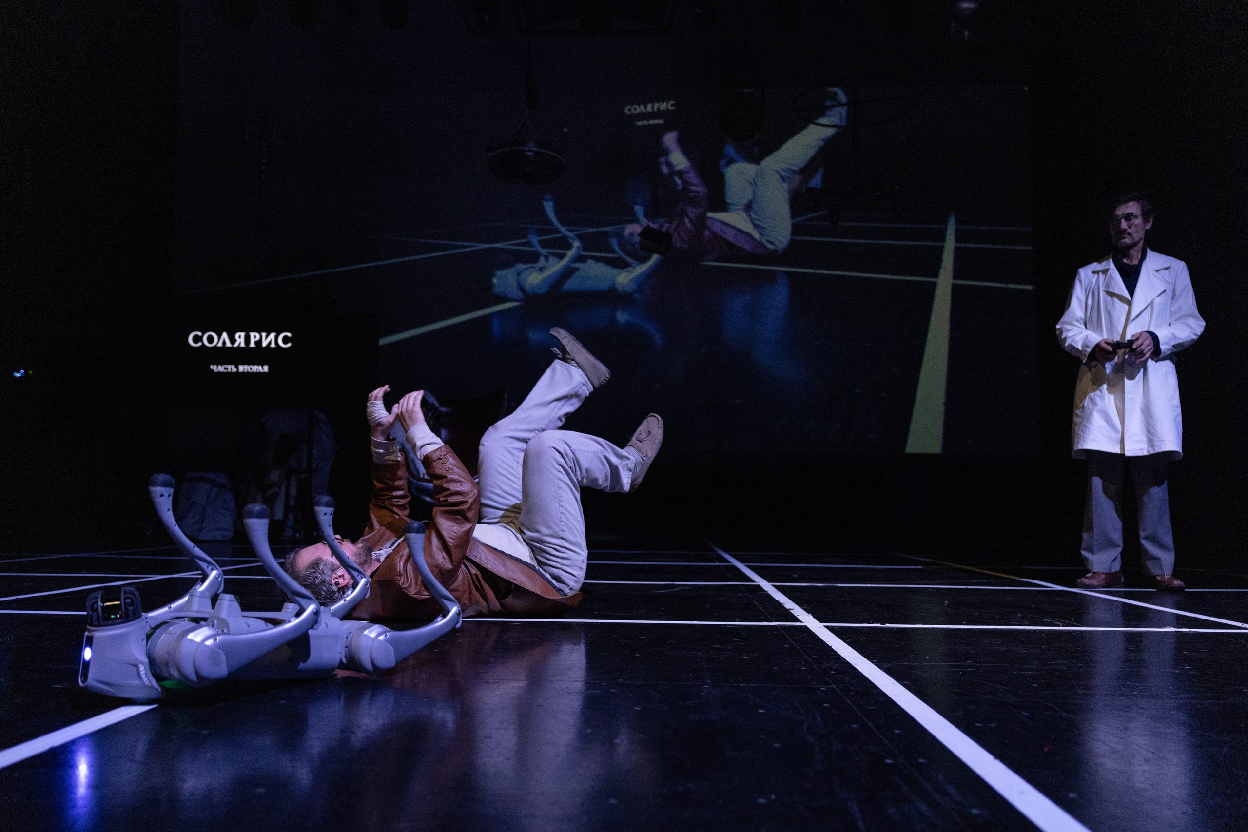 Uz Kelvina i Hari, na sceni su Snaut (Nikola Nedić) i Sartorius (Sven Medvešek), a izvedba se širi i na video/AI-hibridne nastupe: doktor Gibarian (Frano Mašković) i pilot Henri Berton (Vedran Živolić) postoje isključivo kao snimljena prisutnost. Kao dodatni “gost” pojavljuje se i robotski pas Unitree Go2 AIR – neljudski izvođač koji u Solarisovu logiku drugosti unosi tijelo koje dijeli isti prostor i isto vrijeme s ljudima.